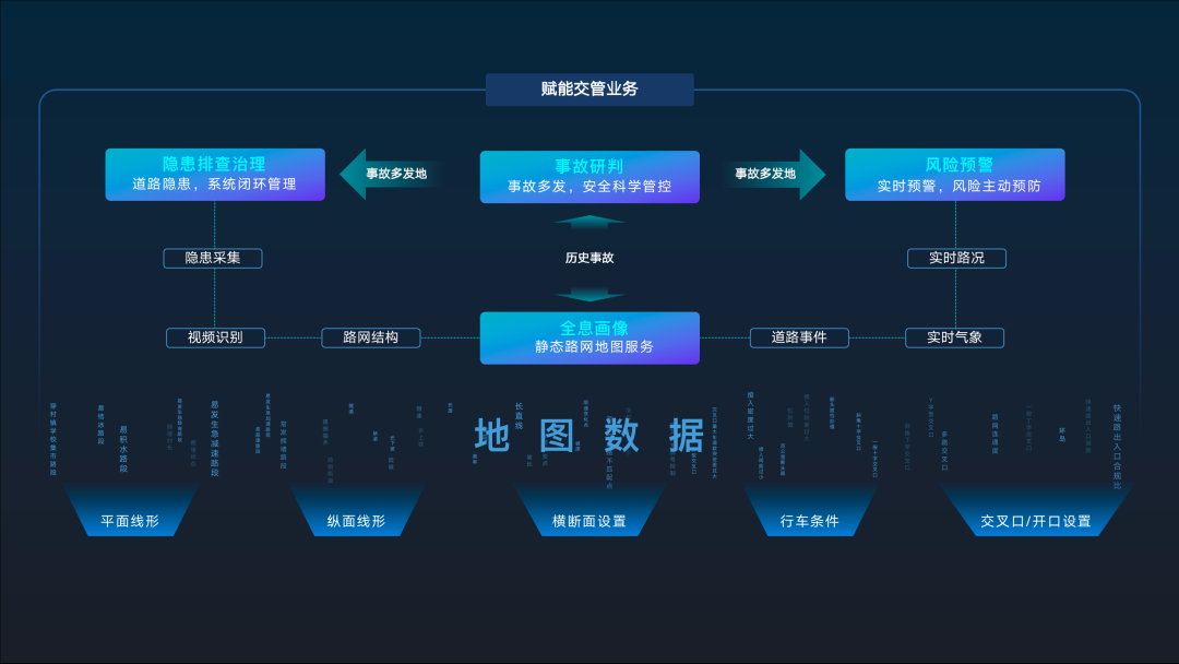 在道路安全风险地图的打造中,首先实现人、车、路、环境、事故等多源数据的汇聚融合,然后对数据进行分析挖掘,围绕不同业务场景构建系列指标体系及安全算法模型,最终实现道路安全风险地图全场景应用。