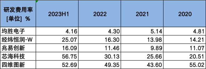 2020年至2023上半年,公司的研发费用率分别为55.02%、43.60%、49.35%和52.69%,远远高于均胜电子、经纬恒润、兆易创新等同行。