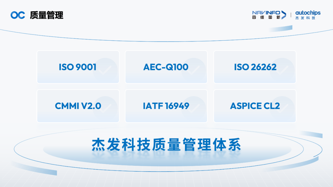 杰发科技始终坚守“安全是汽车的第一要义”,专注提供高可靠、高安全的车规芯片产品和解决方案,具有全面而严格的质量管理体系,包括ISO 9001、AEC-Q100、ISO 26262、CMMI V2.0等,持续践行汽车安全最高标准。