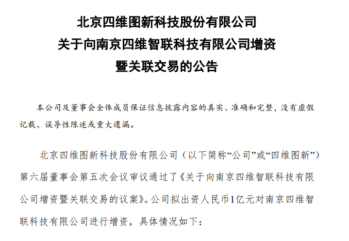 【TechWeb】8月28日消息,北京四维图新科技股份有限公司(以下简称“四维图新”)早间发布公告,参股公司南京四维智联科技有限公司进行战略增资扩股,四维图新及滴滴智慧交通科技有限公司进行增资。四维图新拟出资人民币1亿元对南京四维智联科技有限公司进行增资。