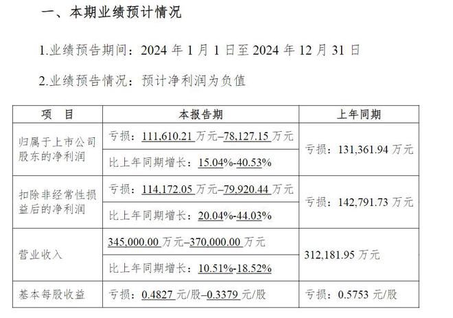 公告显示,预计2024年营业收入345000.00万元–370000.00万元,同比增长10.51%-18.52%;预计归属于上市公司股东的净利润亏损78127.15万元–111610.21万元,同比减亏15.04%-40.53%。