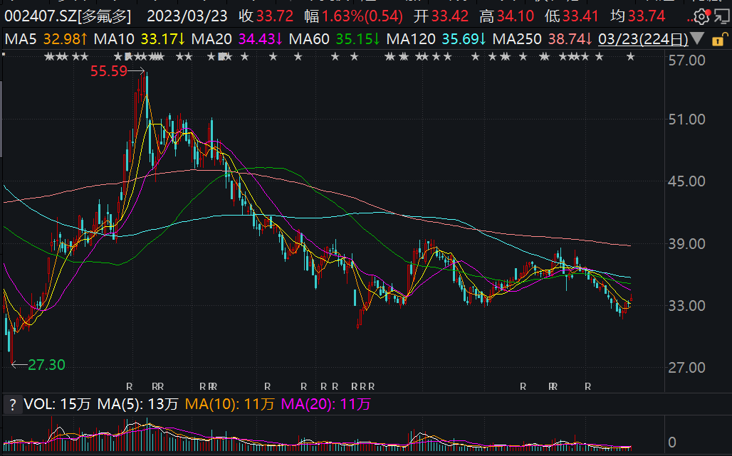 和锂电行业其他上市公司一样,从2022年7月起,多氟多的股价便一路向下。2022年7月7日,多氟多的股价曾最高达到过55.59元/股。截至2023年3月23日,多氟多的股价以上涨1.63%报收33.72元。