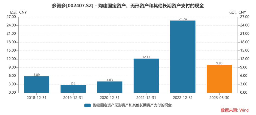 作为一家老牌氟化工企业,公司在承接产业东风,实现品类放量、利润增长的过程中,也一直没有放缓扩张的步伐,始终保持了旺盛的资本开支。在22年实现利润大涨的同时,公司以更大力度投资改扩建和新建产线,资本开支更是创纪录地突破25亿。