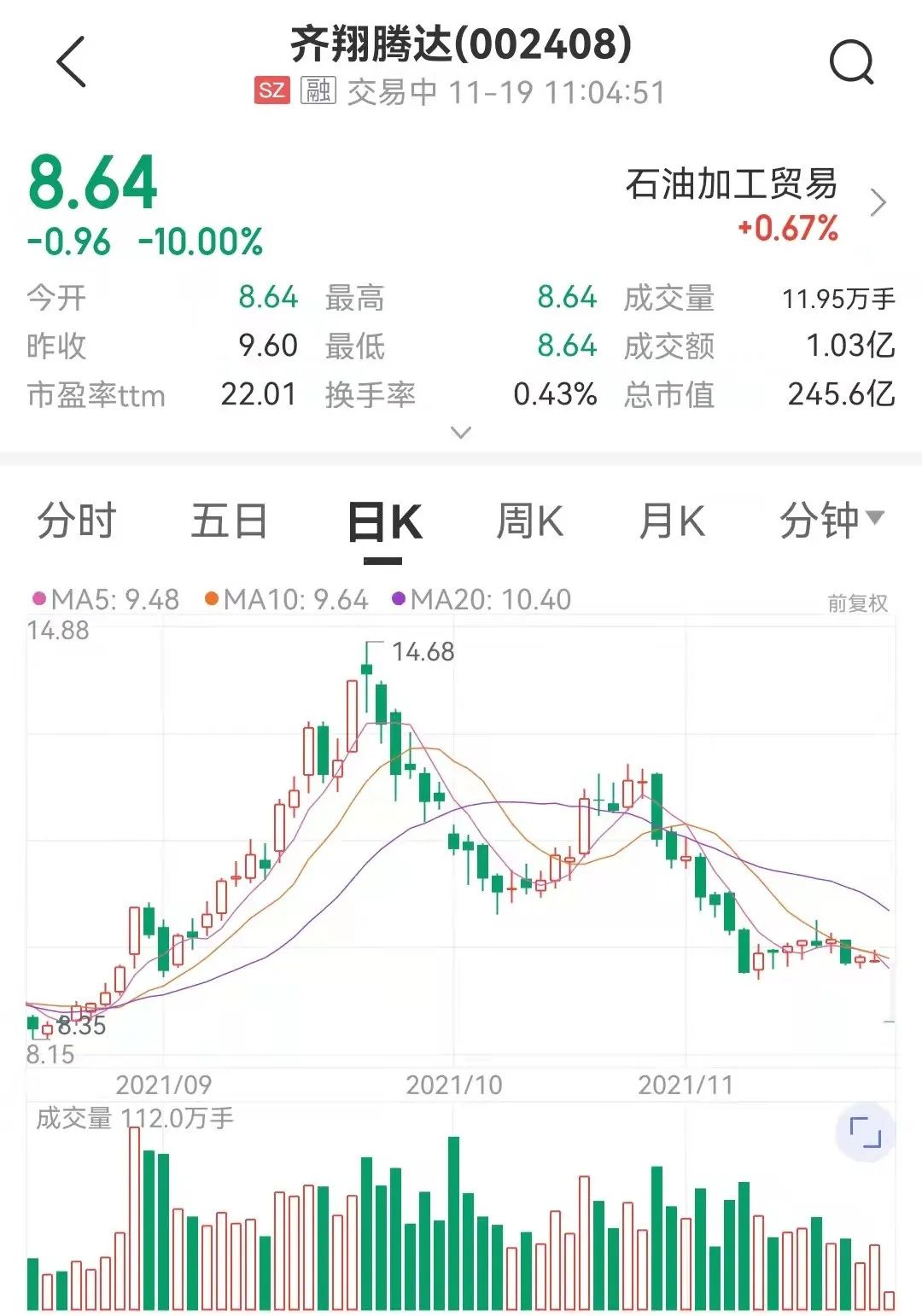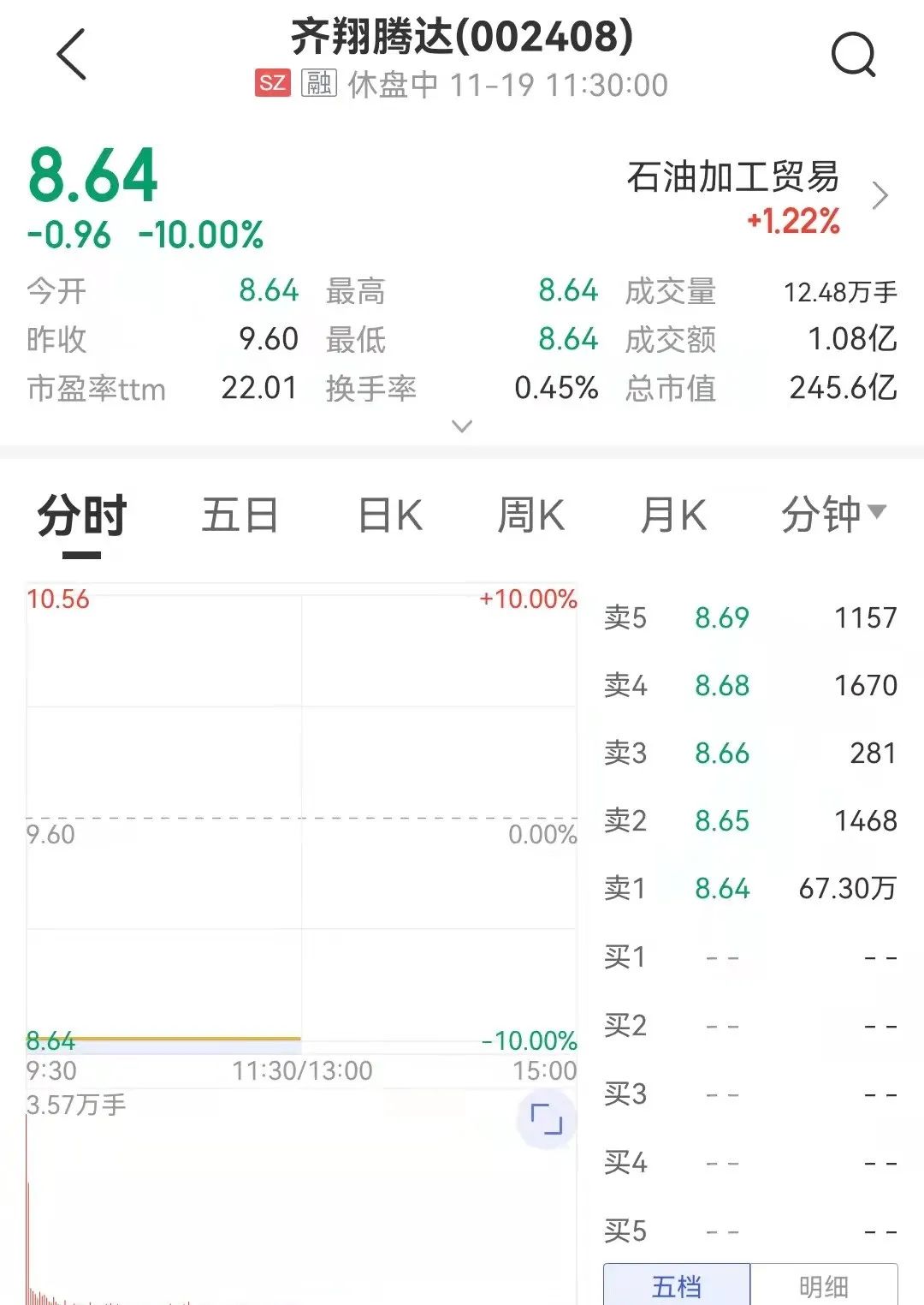 齐翔腾达19日开盘一字跌停,跌停板上封单近20万手。截至上午收盘,齐翔腾达跌停板上的封单逾67万手。