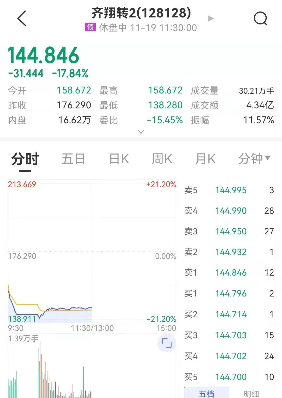 此外,齐翔腾达的可转债齐翔转2早盘在大幅低开后迅速下挫,10分钟跌幅便达到20%触及临停,恢复交易后一度跌逾21%,随后有所回升。截至上午收盘跌幅仍在18%左右。