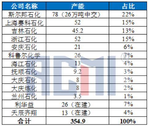 表 2021年底我国丙烯腈装置及产能(万吨/年)