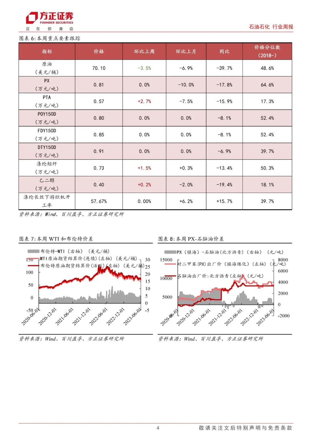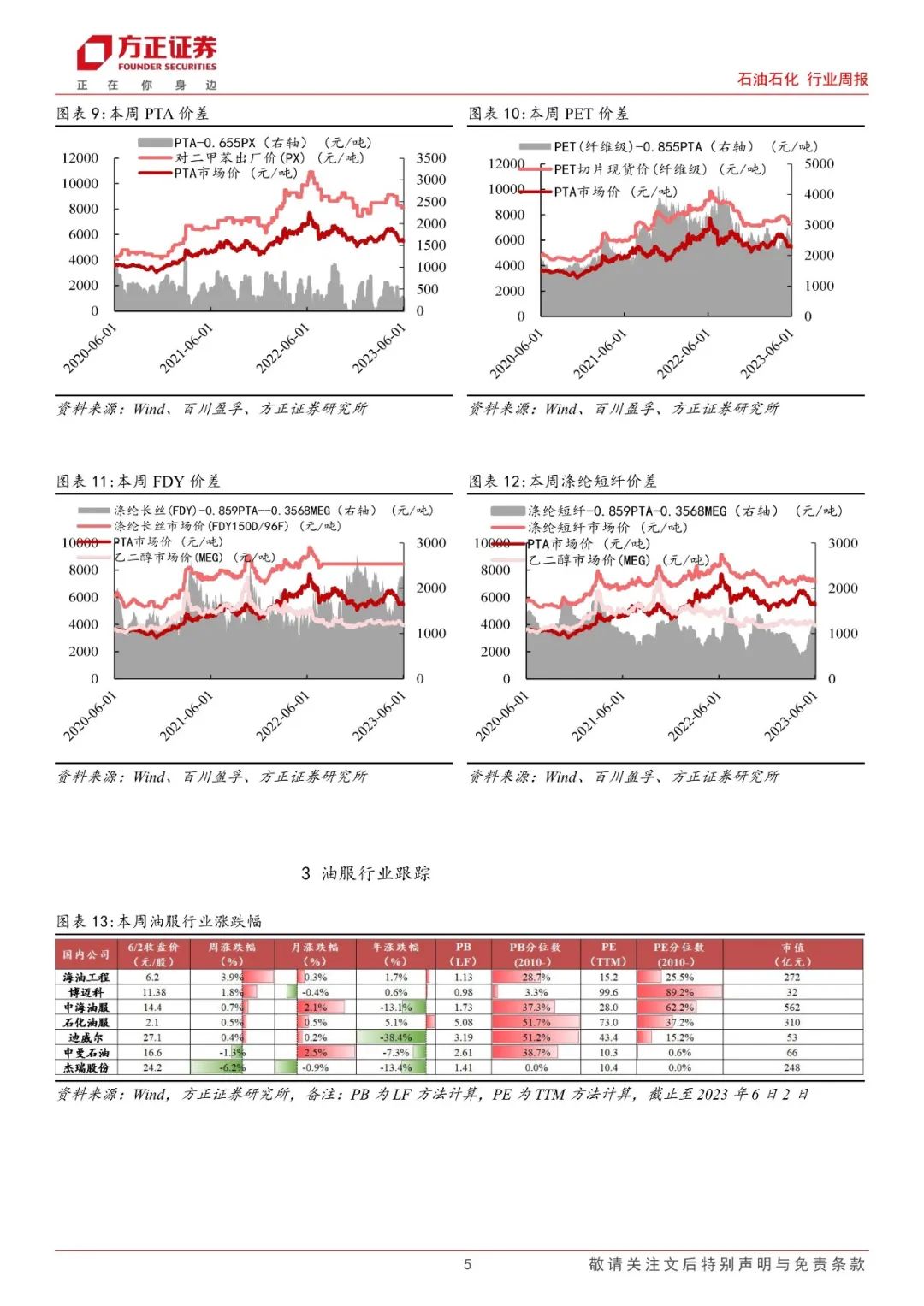 3.石油化工品:截至2023年6月1日,PX价格为8100元/吨,周环比不变。PTA价格为5700元/吨,周环比上升2.7%。涤纶长丝,POY150D/FDY150D/DTY150D的市场价格分别为7950/8450/9100元/吨,周环比不变。涤纶短纤价格为7300元/吨,周环比上涨1.5%。乙二醇价格3964元/吨,周环比上涨0.2%。
