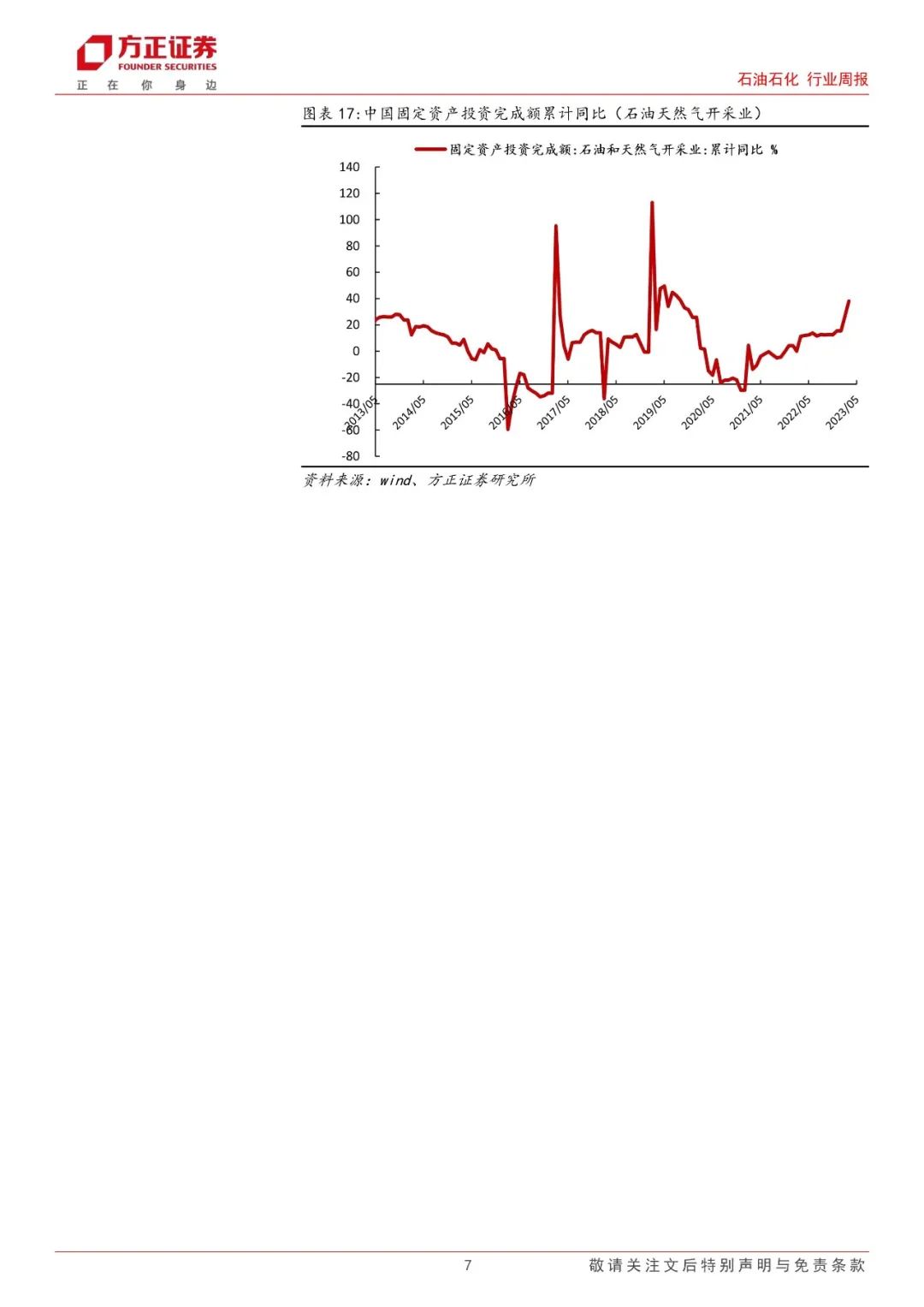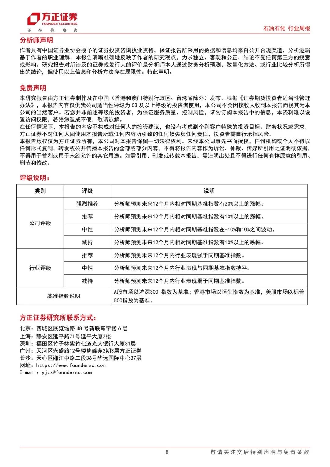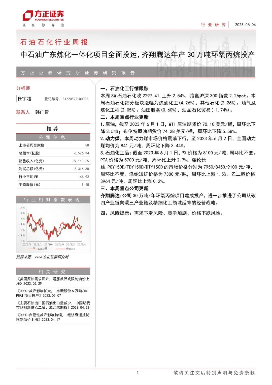 本周SW石油石化收2297.41,上升2.54%,跑赢沪深300指数2.26pct。本周石油石化细分板块涨幅为炼油化工(4.26%)、其他石化(2.26%)、油气及炼化工程(2.05%)、油田服务(0.60%)、油品石化贸易(-1.74%)。