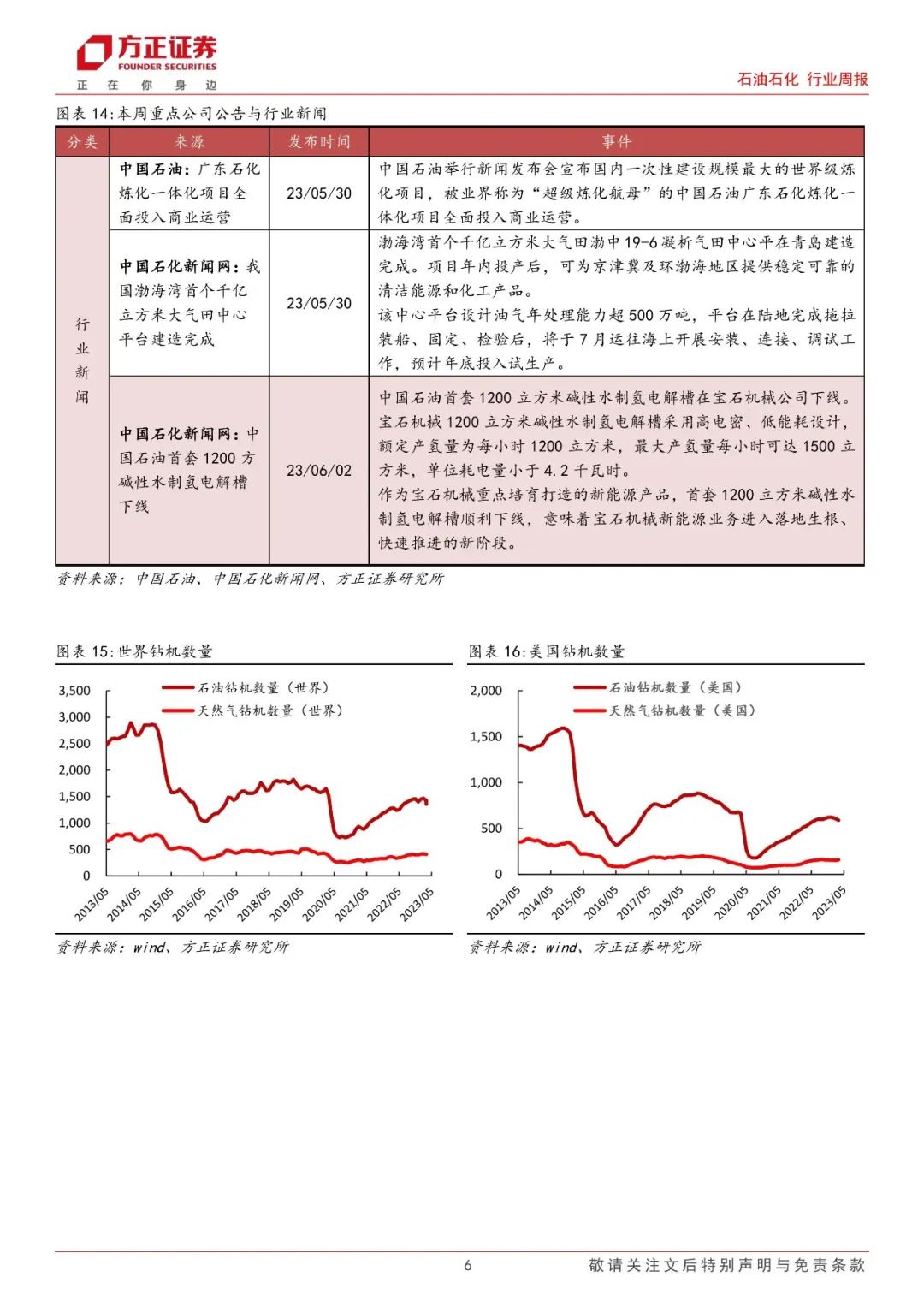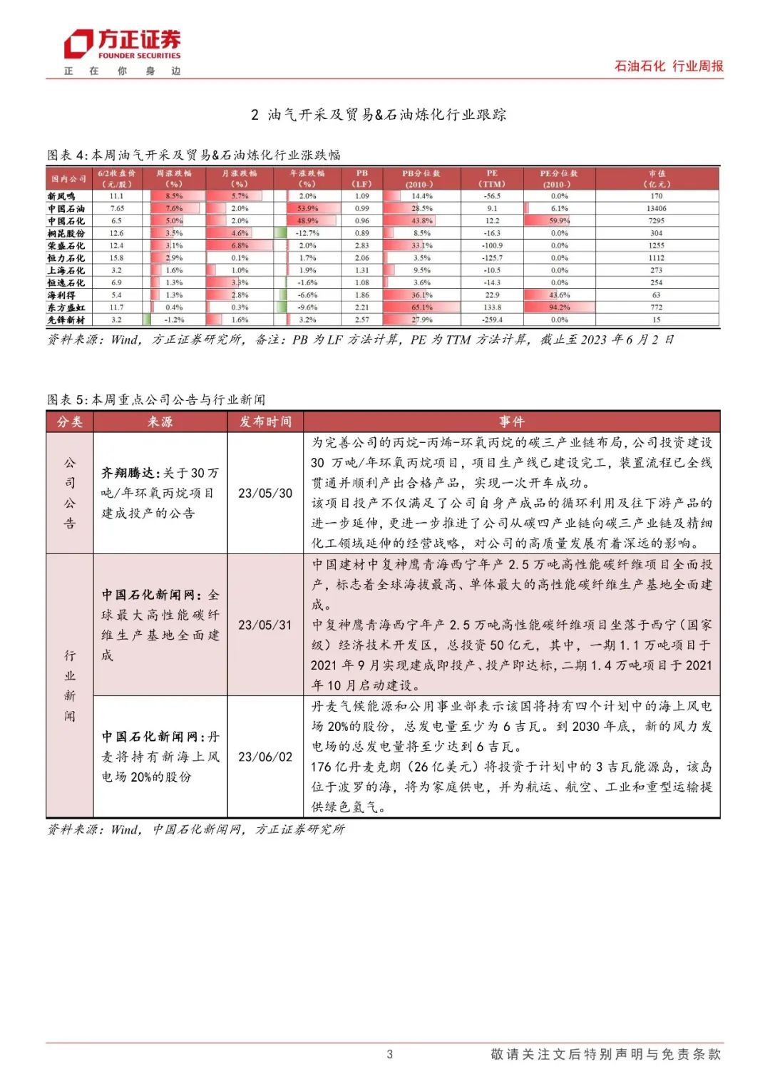 1.原油,截至2023年6月1日,WTI原油期货价70.10美元/桶,周环比下降3.54%;布伦特原油期货价74.28美元/桶,周环比下降5.58%。