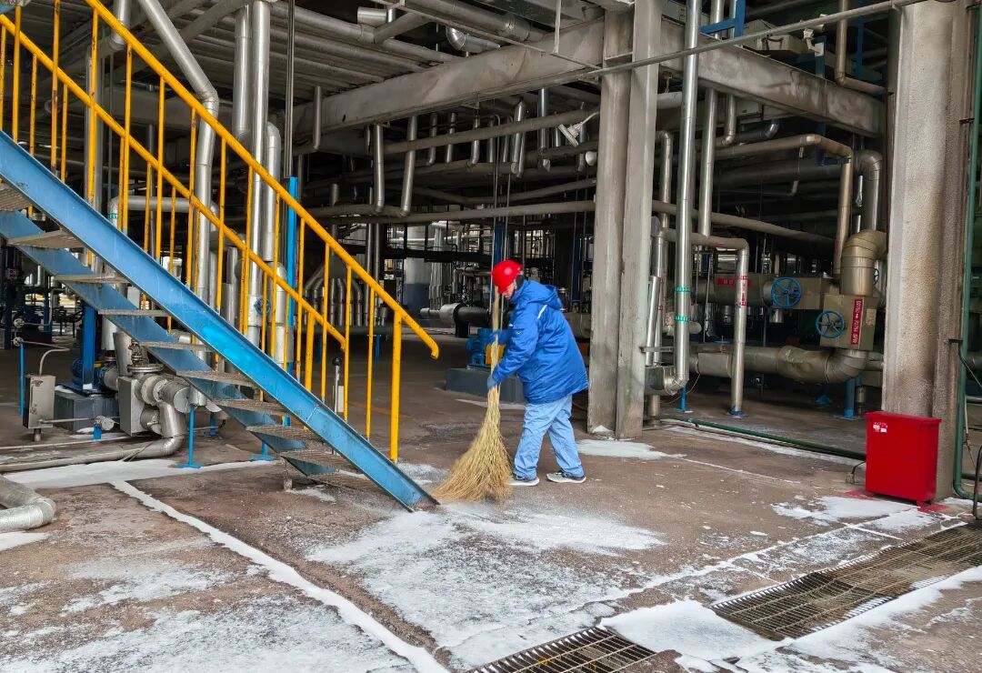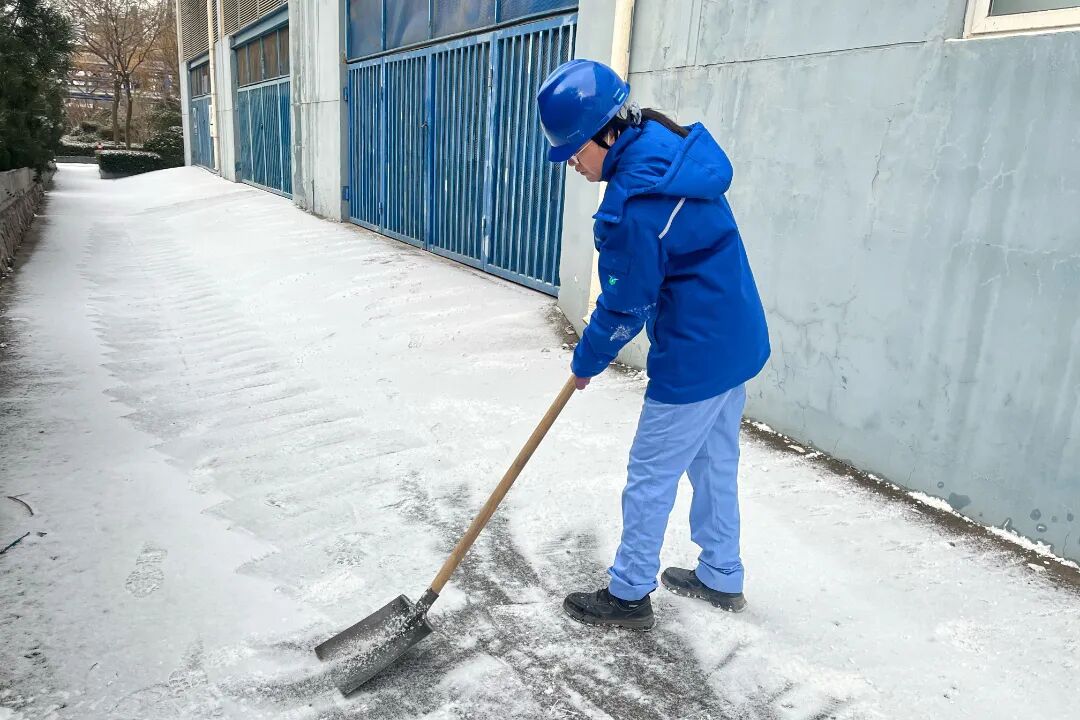 铁锹与冰面的碰撞声、扫帚划过地面的沙沙声交织成冬日交响曲,同时,在易滑的楼梯、通道处铺设防滑垫并设置警示牌,在道路上撒盐防冻,为职工出行及生产巡检筑牢安全屏障。从主干道到装置区,从楼梯间到采样点,积雪以肉眼可见的速度消失,取而代之的是整洁通畅的“安心路”。