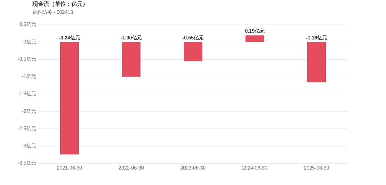 在经营稳健性方面,雷科防务面临现金流转负的压力,存货周转天数为464.76天,较2024年上半年下降69.52%,表明存货管理效率有所提升。经营活动产生的现金流净额为-1.16亿元,相比2024年同期的0.19亿元由正转负,显示出经营活动现金流承压。此外,2025年上半年的资产负债率为28.69%,同比增长5.31个百分点,债务水平有所上升。