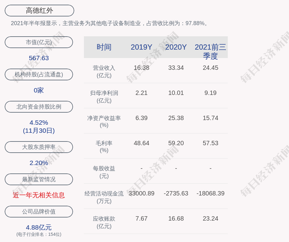 2021年半年报显示,高德红外的主营业务为其他电子设备制造业,占营收比例为:97.88%。