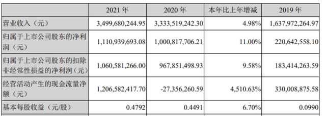 4月7日,高德红外发布年度业绩报告称,2021年营业收入约35亿元,同比增加4.98%;归属于上市公司股东的净利润约11.11亿元,同比增加11%;基本每股收益0.4792元,同比增加6.7%。