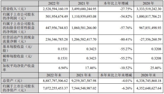 4月20日讯高德红外(002414.SZ)于昨日晚间发布2022年年度报告,公司2022年实现营业收入25.29亿元,同比下降27.75%;归属于上市公司股东的净利润为5.02亿元,同比下降54.82%;归属于上市公司股东的扣除非经常性损益的净利润为4.48亿元,同比下降57.76%;经营活动产生的现金流量净额为2.36亿元,同比减少80.41%。