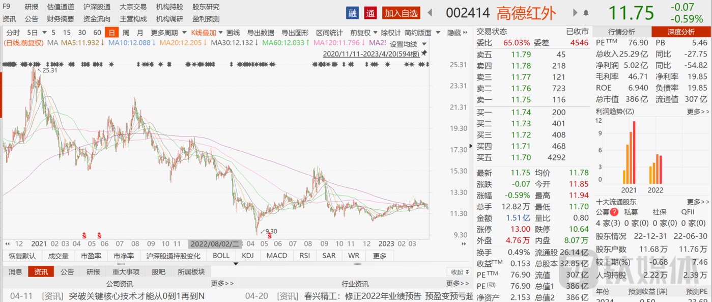 虽然诸多券商称,高德红外是红外热成像行业龙头,民警军工集团开拓者,但因为军工整体走势颓废,加上近日高德红外年报利空,二级市场也顺势杀跌,股价整体走势很低迷。截至4月20日收盘,公司股票下跌0.59%,收报11.75元,总市值386亿元。