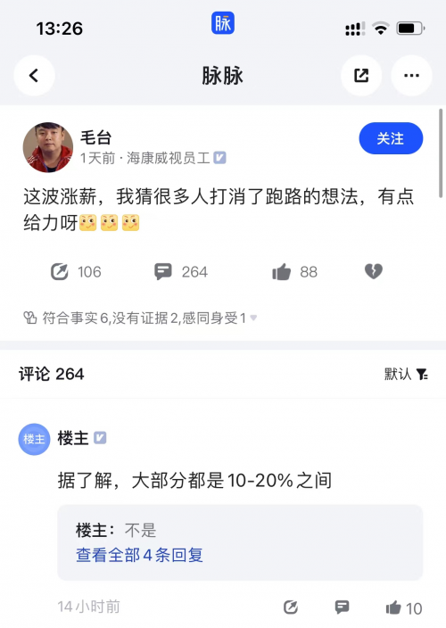 在另一条求证海康涨薪的脉脉社区贴中,同样有很多海康员工现身说法。一位海康威视软件工程师认证用户回复到“大部分15%以上,去年校招的很多涨30%”,另一位海康威视产品经理认证用户同样表示“今年涨薪很体面”。