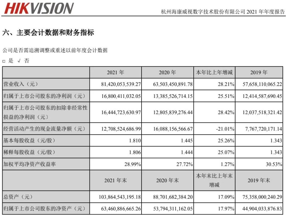 2021年年报显示,海康威视实现营业收入814.20亿元,同比去年增长28.21%;实现归母净利润168亿元,同比去年增长25.51%;实现扣非后归母净利润164.44亿元,同比增长 28.42%。