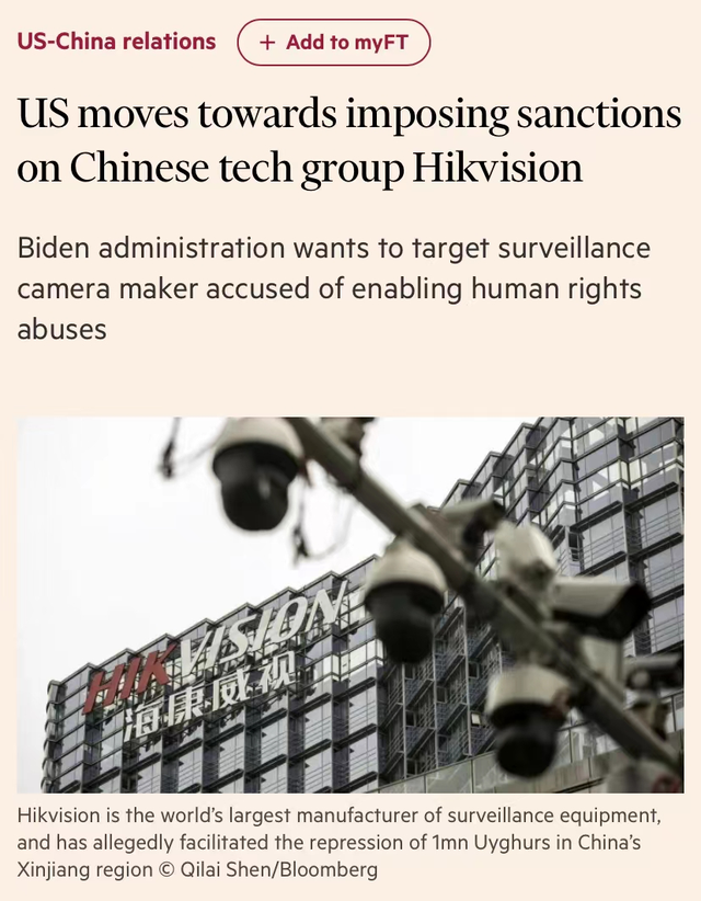 事件主要由英国《金融时报》爆出,其称美国正准备对中国企业海康威视实施制裁,拜登政府已在为这项“与人权有关”的制裁“打基础”。美国政府已向其盟友告知这个意图,希望其它国家不要使用海康威视的监控摄像头等产品。