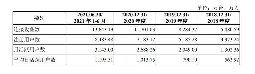 例如2020年度,萤石网络物联网云平台接入设备约11701万台,平台注册用户数7183万,月活用户超过2688万,日活用户超过1013万。作为可比对象,截至2020年12月31日,小米AIoT平台已接入的IoT设备数达3.25亿台(不包括智能手机及笔记本电脑)。拥有五件及以上连接小米AIoT平台设备(不包括智能手机及笔记本电脑)的用户数达到 620万,同比增长 52.9%;米家 App 12月的月活用户数达到 4500万。