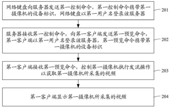 图2为摄像机控制方法流程图,该方法包括如下步骤。首先网络键盘向服务器发送第一控制命令,第一控制命令携带第一摄像机的设备标识,网络键盘以第一用户名登录该服务器(201)。然后服务器接收第一控制命令,向第一客户端发送第一预览命令,第一客户端以第一用户名登录该服务器,第一预览命令携带第一摄像机的设备标识(202)。之后第一客户端接收第一预览命令,控制第一摄像机执行发流操作以获取第一摄像机所采集的视频(203)。最后第一客户端显示第一摄像机所采集的视频(204)。