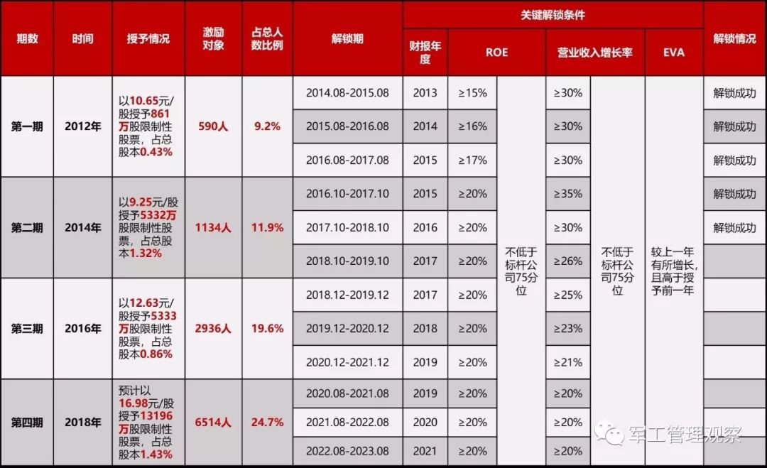 1.频率:每两年发一期,每期分三次解锁,第一次锁定期为2年:这样的方式绑定作用持续,所有激励对象每年手上都有正在解锁的股票和尚未解锁的股票,新招聘人员也能够在较短周期就有机会纳入激励范围。