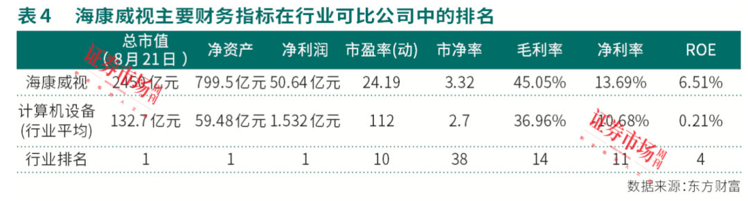 在净利润和营收这两大指标之外,其他财务指标方面,海康威视在51家计算机设备行业可比公司中的表现也可圈可点,比如其净资产规模位居行业第一、净资产收益率(ROE)位居行业第四等(见表4)。
