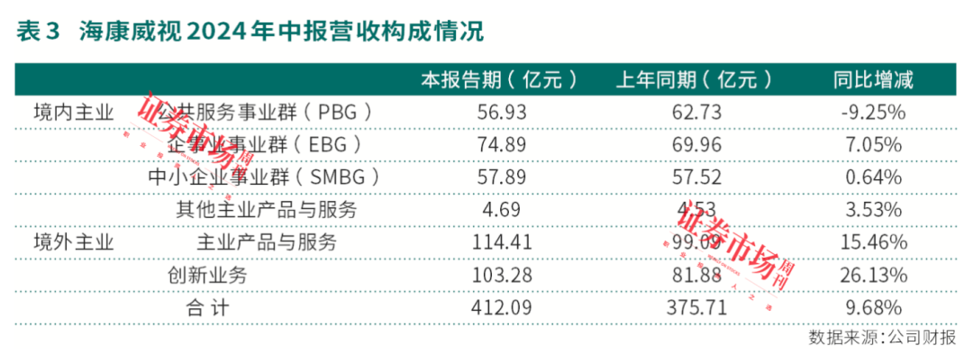 与业绩波动表现相比,海康威视营收表现相对亮眼,总营收从2020年的635亿元增长到2023年的893.4亿元,每年增长率均为正值。到今年中报,公司实现营收412.09亿元,同比增长9.68%——依然为正增长。在其业务收入构成中,海康威视境外业务和创新业务收入均实现两位数增长(见表3)。