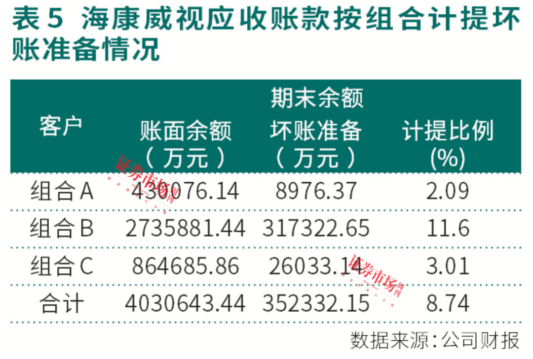 据公司财报,海康威视应收账款按组合分布来看,其组合B应收账款账面余额达273.59亿元,坏账准备31.73亿元,计提比例为11.6%(见表5)。