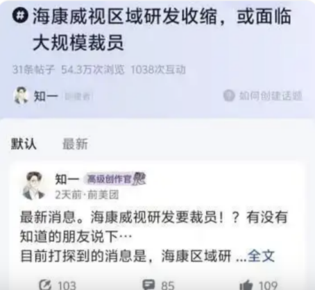 随着管理层的调整,裁员的消息也随之而来。去年10月,有网友在社交应用脉脉上爆料称,海康威视近期正在进行大规模组织调整,预计裁员人数将突破千人大关,而研发部门是裁员重灾区,32个研发区域收缩到12个。
