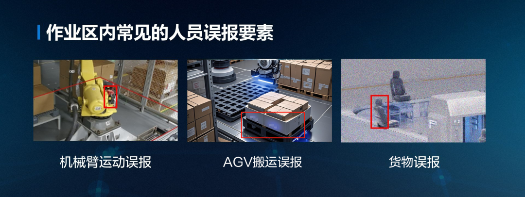 机械臂作业区场景复杂,往往存在机械臂运动、AGV搬运、叉车搬运、不同类型货物等干扰因素。传统的深度学习算法容易因局部相似度过高、复杂姿态等因素产生误报。比如,将机械臂的部分结构误认为是人员的肢体,导致误检出人员,影响生产效率。