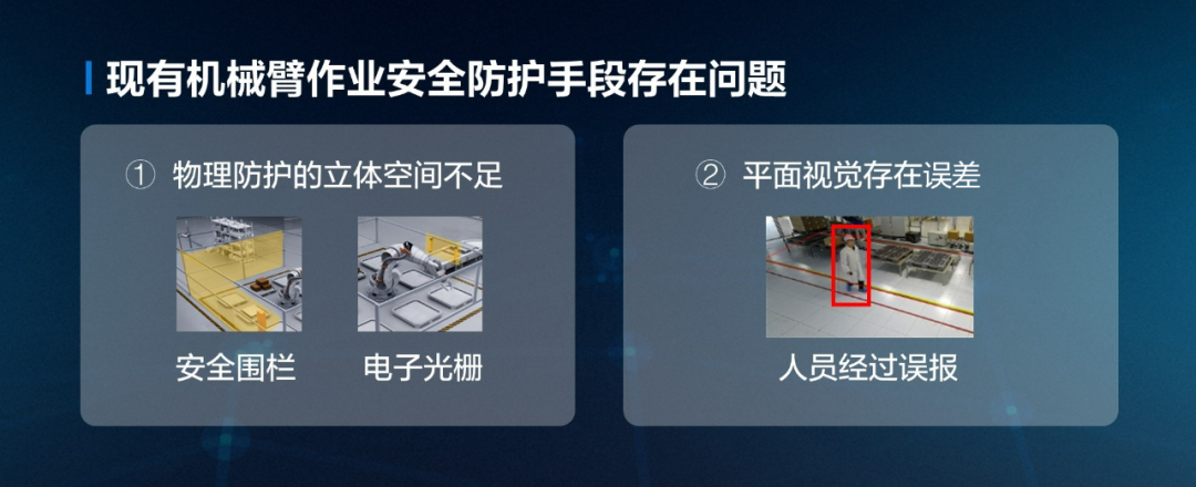 在工厂、车间等机械臂作业区域,现有安全围栏、光栅等防护措施,无法全面覆盖作业区内的立体空间,当人员滞留作业区内,机械臂意外启动,会存在较大碰撞风险,运用视觉手段可有效提升作业区安全防护水平。