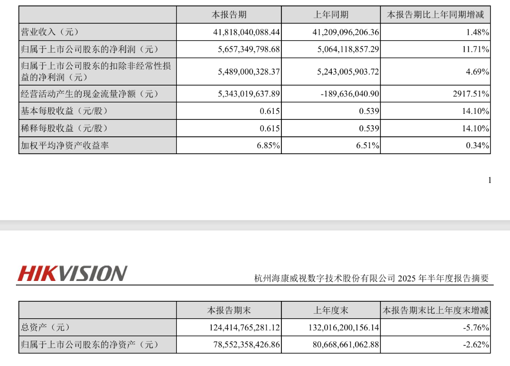 海康威视2025上半年营收增长1.48%,净利润增长11.7%达到56.6亿元,但主要受益于成本控制。