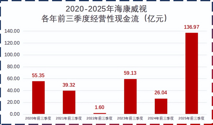 除此之外,2025年前三季度海康威视经营性现金流净额高达136.97亿元,对比去年同期的26.04亿元,增长了426.06%。