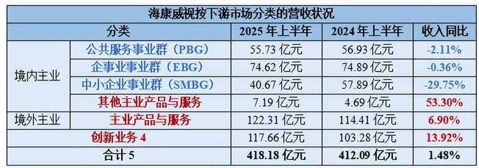 按照下游市场分类来看,海康威视用创新业务替代传统主业的趋势则更为明显。