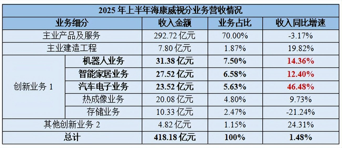 2025年上半年,海康威视的安防主业营收略微下滑3.17个百分点,比去年同期减少约10个亿的收入。