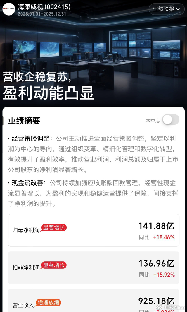 2026年1月20日晚间,安防巨头海康威视的一纸业绩快报,让市场再次陷入了关于“成长”与“价值”的激烈辩论。在这份答卷中,一个极其刺眼的数字——0.024%的营收增速,似乎宣告了这家昔日白马股高速扩张时代的终结。