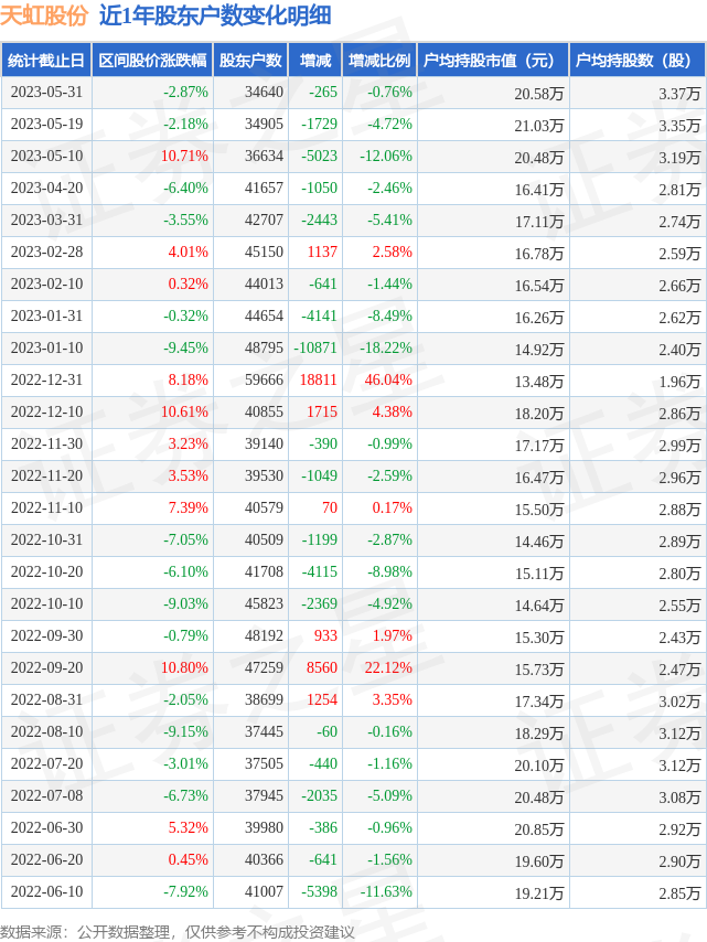 从股价来看,2023年5月19日至2023年5月31日,天虹股份区间跌幅为2.87%,在此期间股东户数减少265.0户,减幅为0.76%。