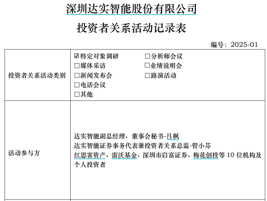 【环球网财经记者田刚】2025年1月6日,上市公司达实智能(002421.SZ)发布了《投资者关系活动记录表》,披露公司接待了红思客资产、雷沃基金、深圳市启富证券、梅花创投等10位机构及个人投资者的现场参观,公司副总经理、董事会秘书吕枫等管理层人士参与,并解答投资者提问。