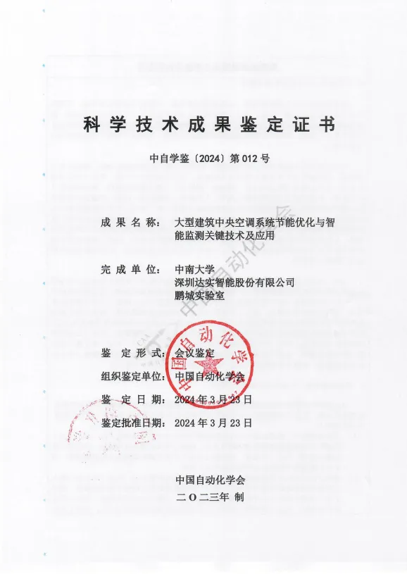 由中南大学、达实智能、鹏城实验室共同完成的“大型建筑中央空调系统节能优化与智能监测关键技术及应用”获得技术成果鉴定证书。据介绍该项目成果技术难度大、创新性强,整体技术处于国际先进水平,面向多机互联的中央空调系统节能优化控制技术达到国际领先水平。