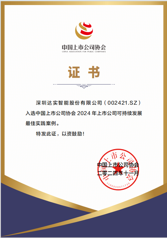 凭借在节能低碳领域的持续创新,公司申报的《发挥ESG价值,创新技术助推双碳战略实现》案例,荣获中国上市公司协会的年度最佳ESG实践案例奖。该奖项,由中国上市公司协会面向5000多家中国上市公司优中选优评出,2024年只有135项案例获此殊荣,充分体现了社会对达实智能的鼓励和认可。