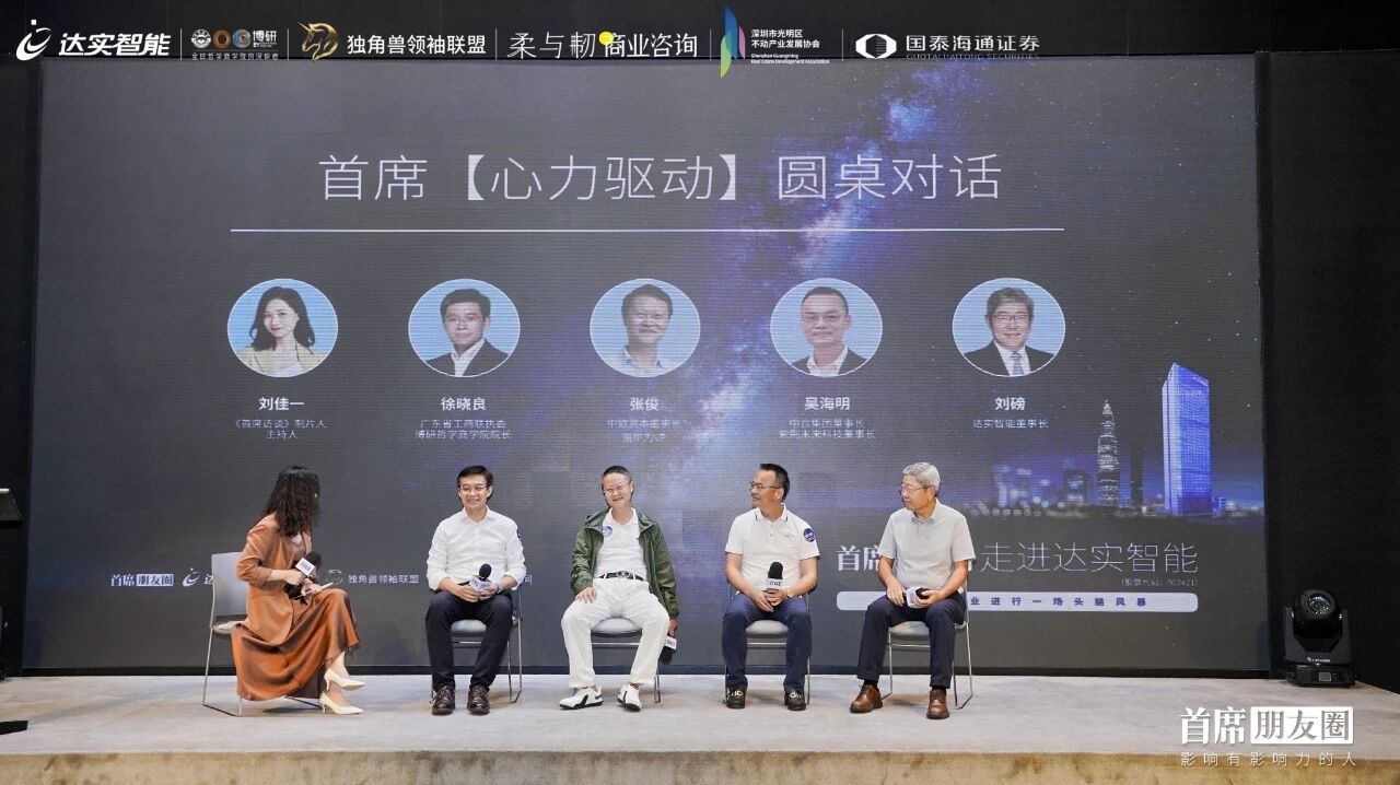 本次活动圆桌对话环节金句频频,掌声阵阵。《首席访谈》制片人刘佳一作为主持人,与博研商学院院长徐晓良,中欧资本董事长、原华为VP张俊,中合集团董事长、紫荆未来科技董事长吴海明,达实智能董事长刘磅围绕“心力驱动”展开深度对话。