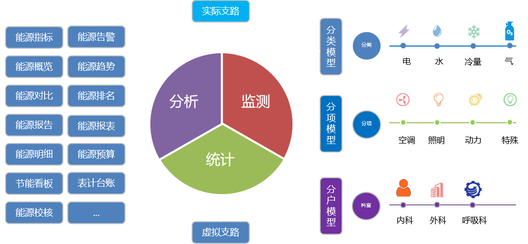 构建多维度能耗数据模型,对全院公共区域和科室做能源的精细化管理,实现按科室实际使用情况、精准计量水、电、气的用能成本。