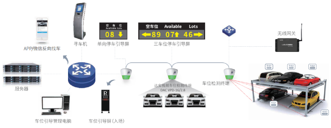 通过入口车位引导屏,展示各区域车位剩余总数。同时,通过路线指引标识帮助车主抵达目标区域。在每个/多个车位安装视频车位探测器,通过车位指示灯的颜色快速找到空闲车位停车(绿色代表空闲)。