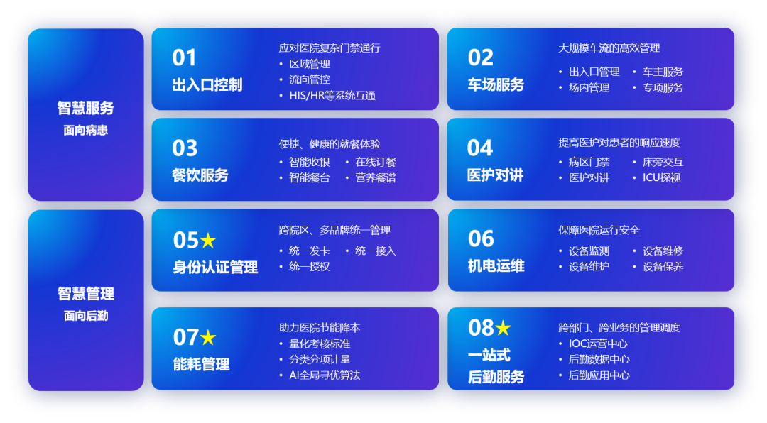 区分患者及陪护人员、探视人员、医务人员、外包服务人员、后勤管理人员等角色,区分住院楼、医技楼、手术室、行政楼、药房等区域,同时根据不同时段的特点,给予医院病患和相关用户多种类的出入方式,从而保障医院重点区域的安全。