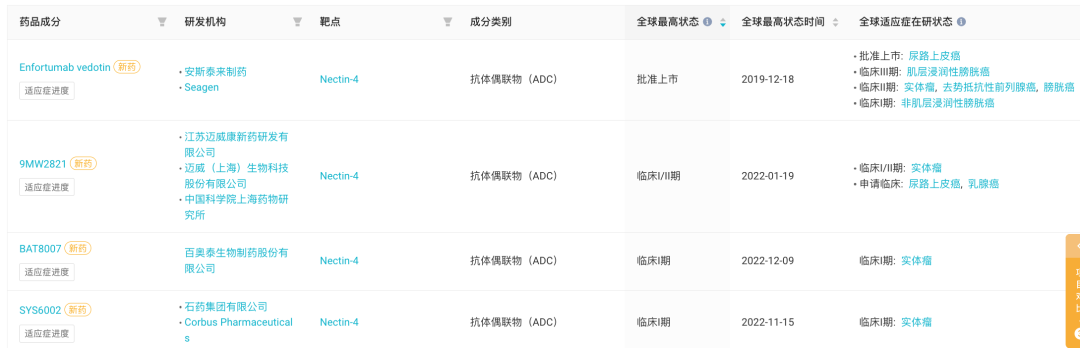 全球进入临床阶段的 Nectin-4 ADC 项目(I 期及以上)