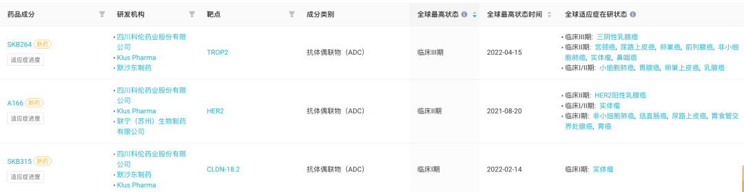 目前,据 Insight 数据库显示,除 SKB410 外,另有 3 款 ADC 进入临床阶段,分别为处于临床 I 期、II 期、III 期的 SKB315、A166、SKB264。