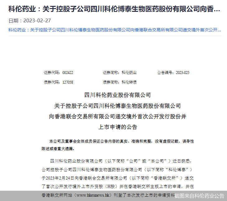 筹划一段时间后,科伦药业子公司科伦博泰正式递交了赴港上市申请,港交所官网也刊登公司发行上市的申请资料。