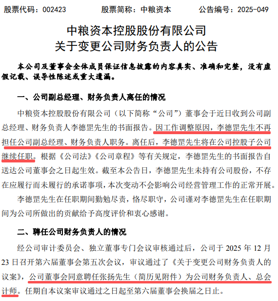 2025年12月24日,深交所主板上市公司中粮资本(002423.SZ)发布了《关于变更公司财务负责人的公告》。公告显示,因工作调整原因,李德罡先生不再担任公司副总经理、财务负责人职务。离任后,李德罡先生将在公司控股子公司继续任职。公司董事会同意聘任张扬先生为公司财务负责人、总会计师。