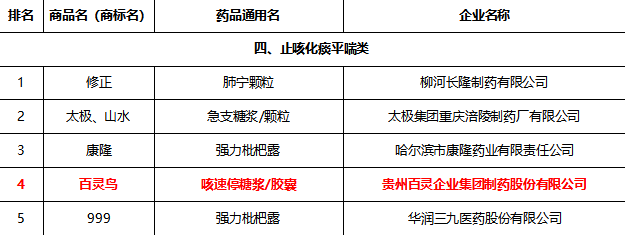 咳速停糖浆/胶囊获得“中成药·止咳化痰平喘类”第4名。