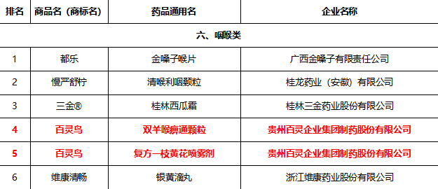 双羊喉痹通颗粒获得“中成药·咽喉类”第4名,复方一枝黄花喷雾剂获得第5名。